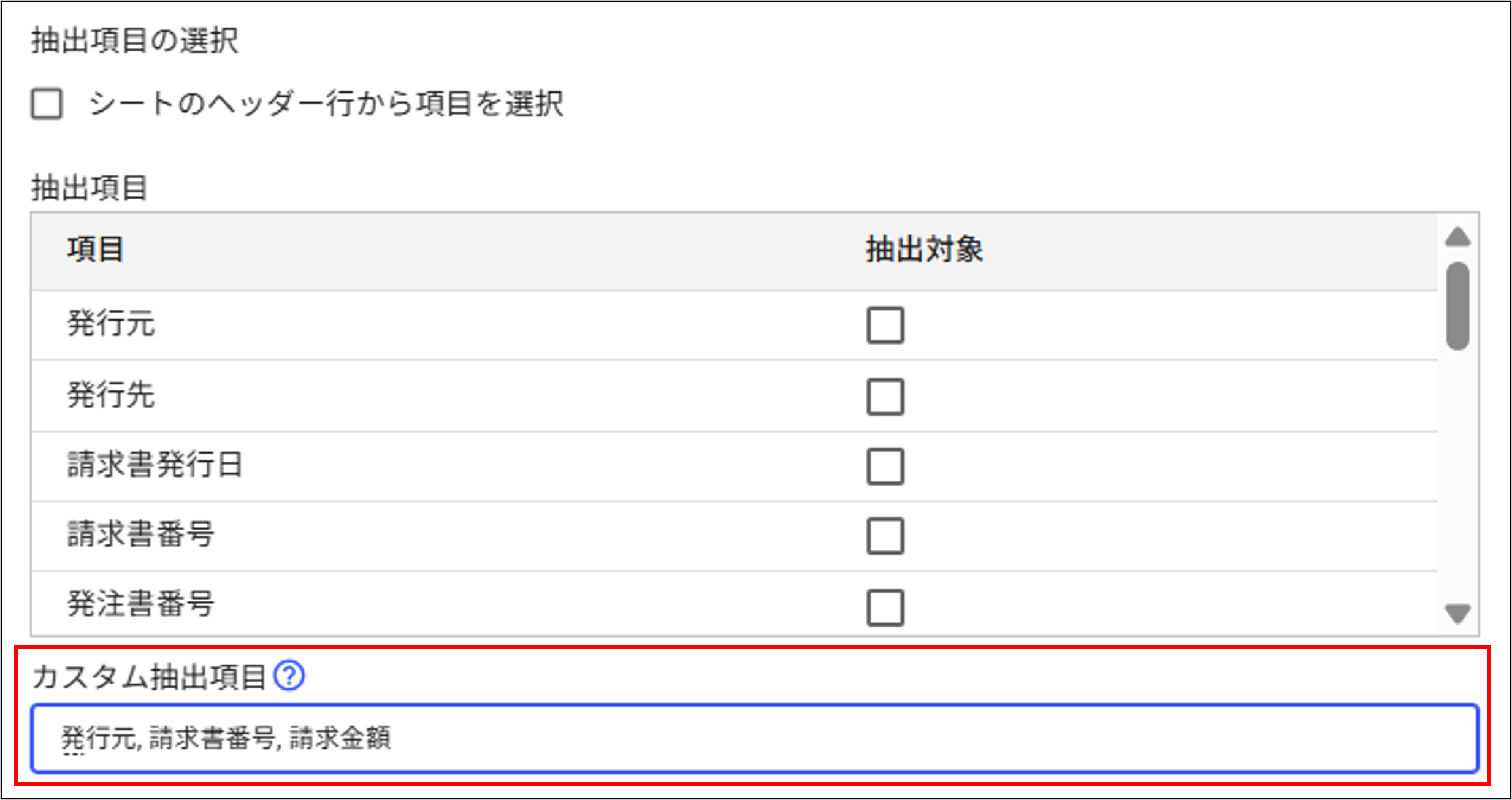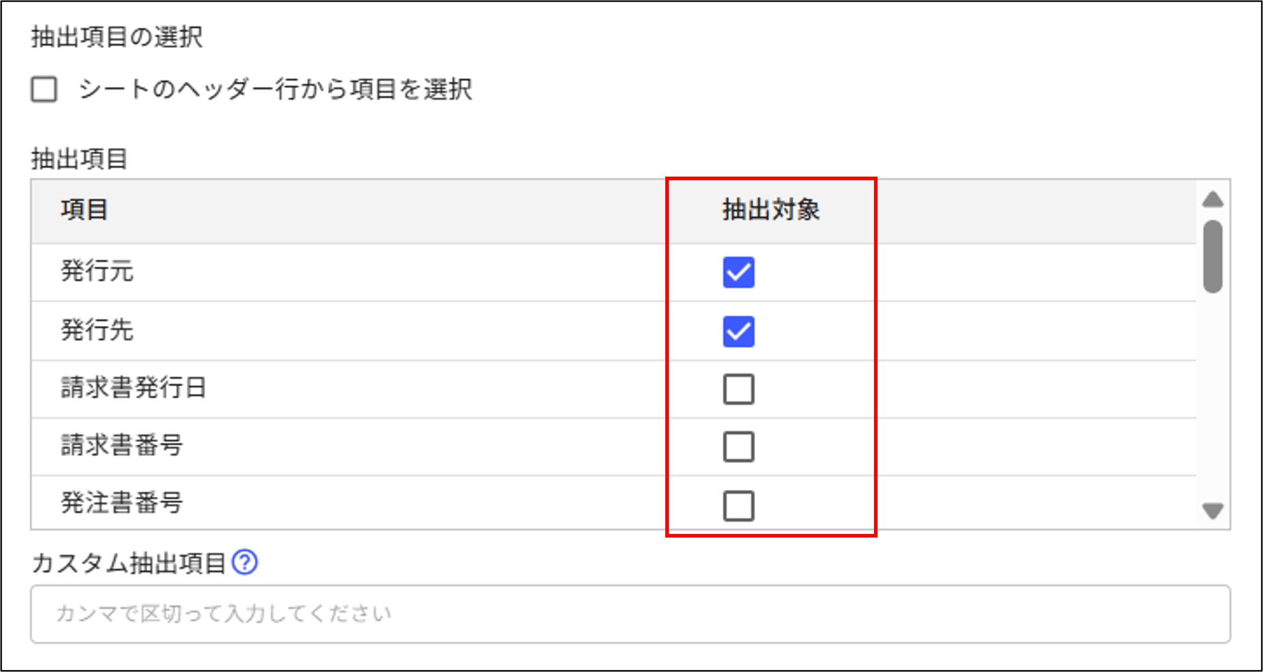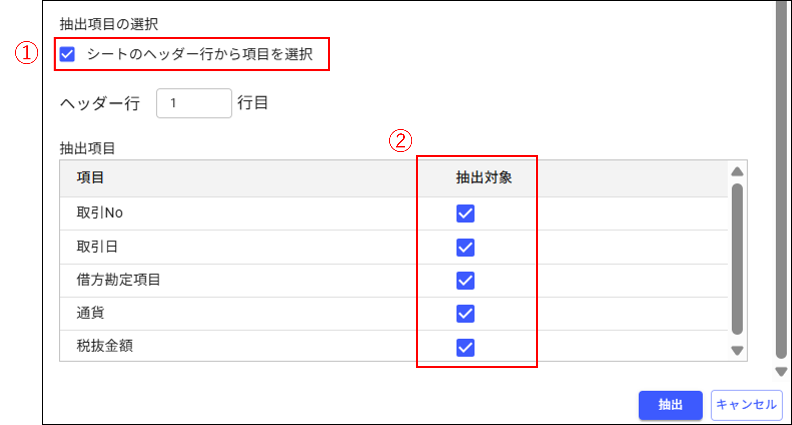 [シートのヘッダ行から項目を選択]にチェックを入れると、ヘッダ名から抽出対象にチェック