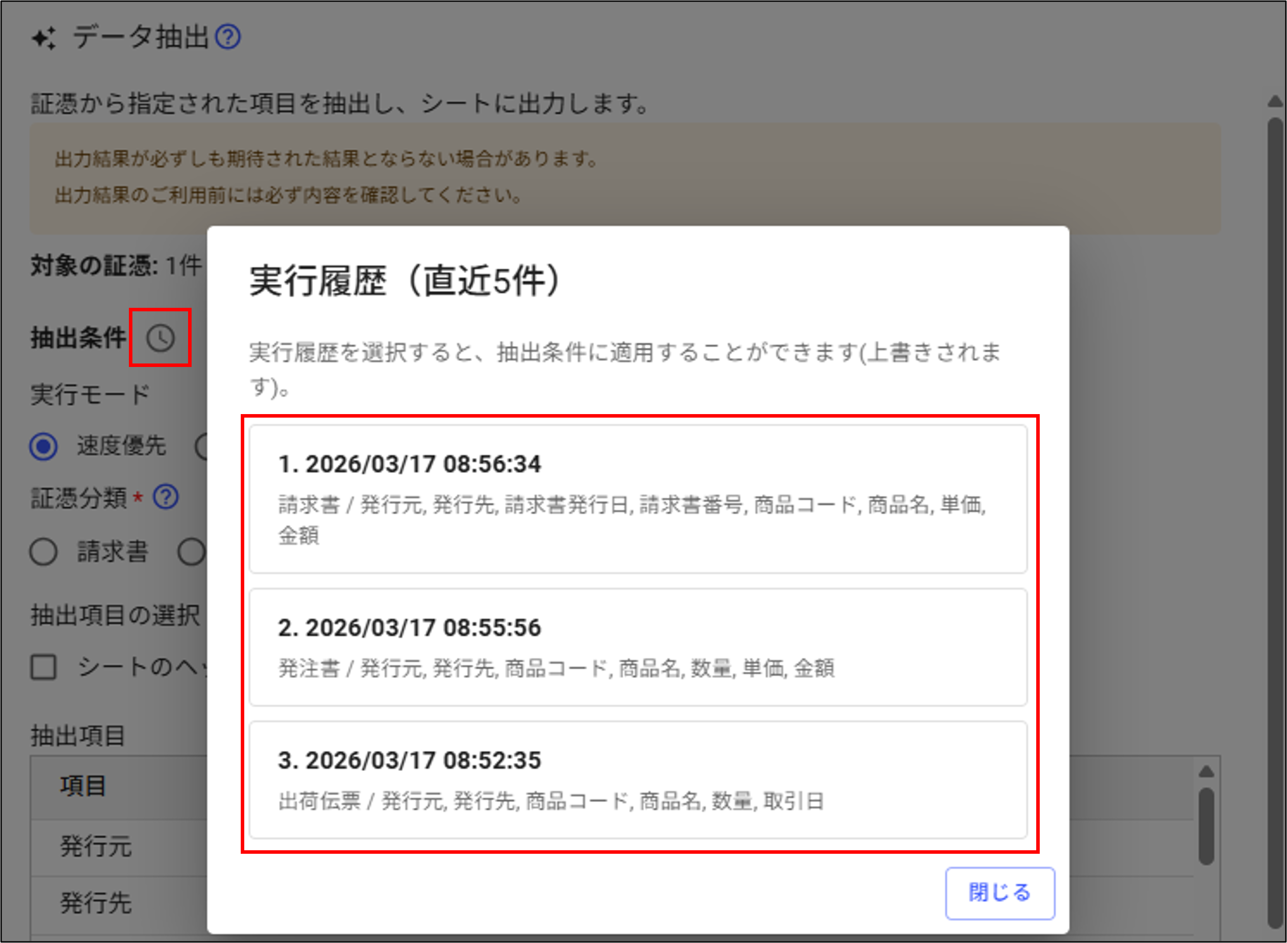 ]ボタンを押すと、直近5件の実行履歴が表示されます。実行履歴を選択すると、過去に使用した抽出条件を現在の設定に適用できます。