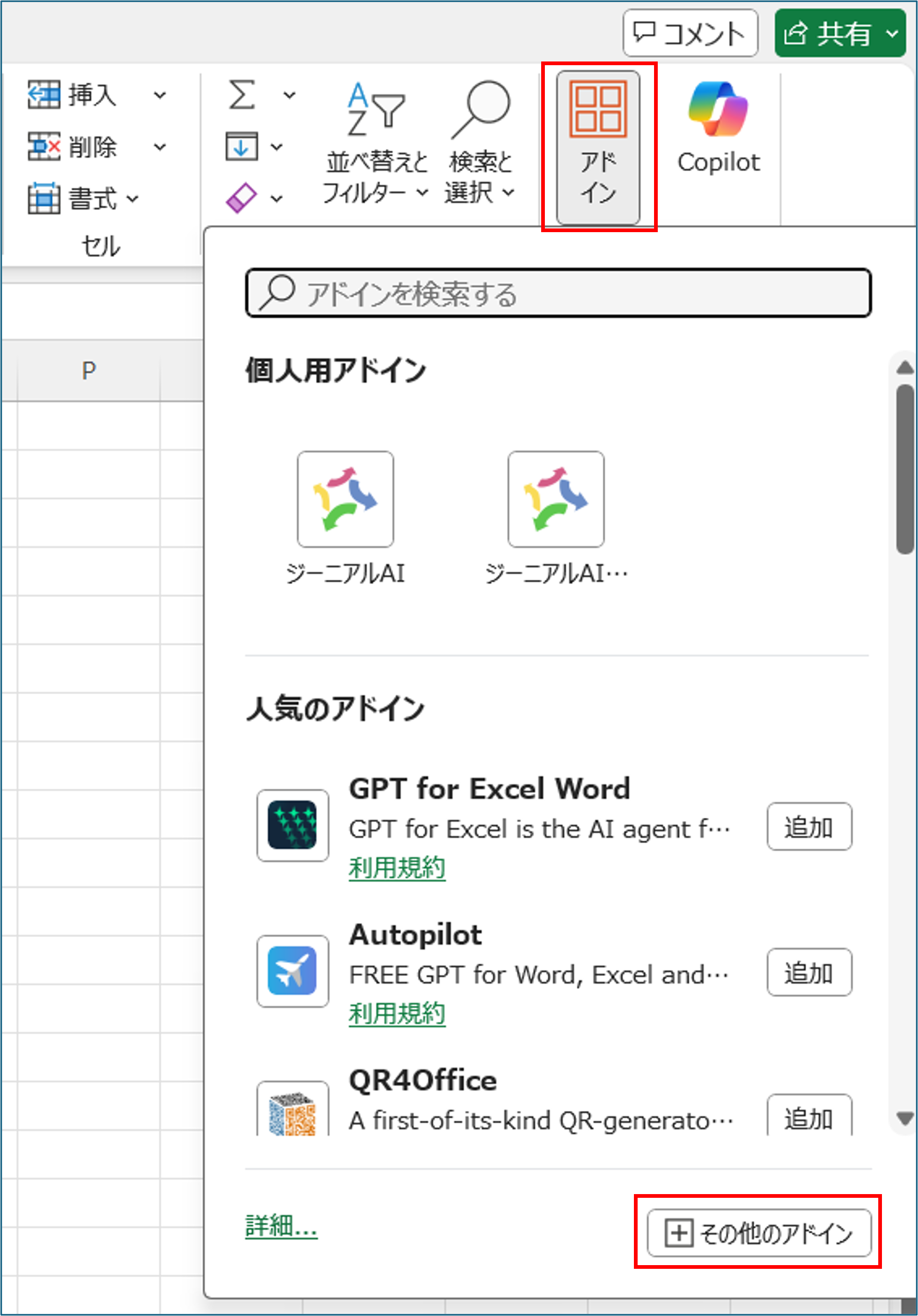Bパターン(Microsoft 365):リボンの[ホーム]>[アドイン]>[その他のアドイン]