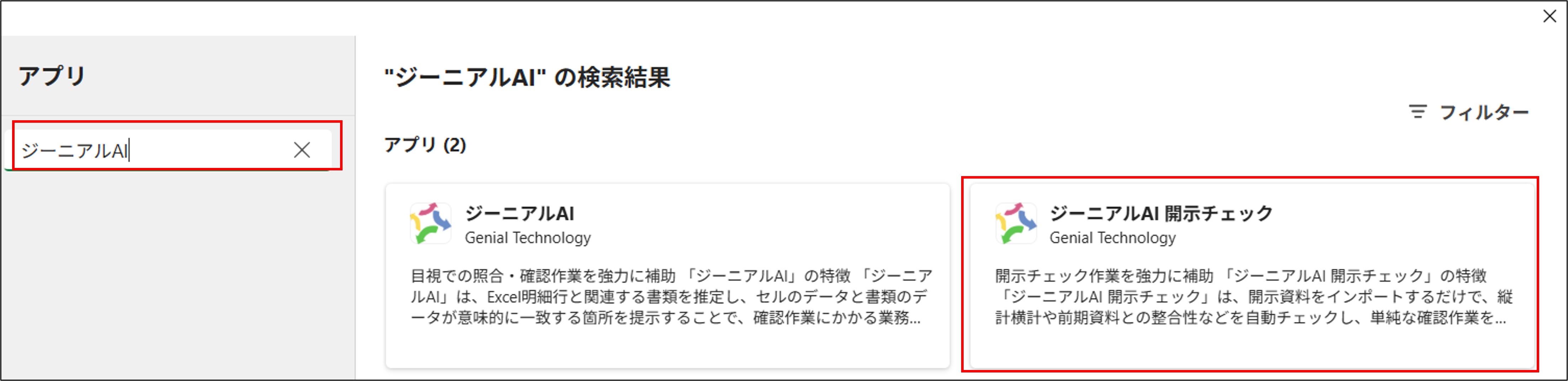 - 検索バーに「ジーニアルAI」と入力し、ジーニアルAI 開示チェックをクリック