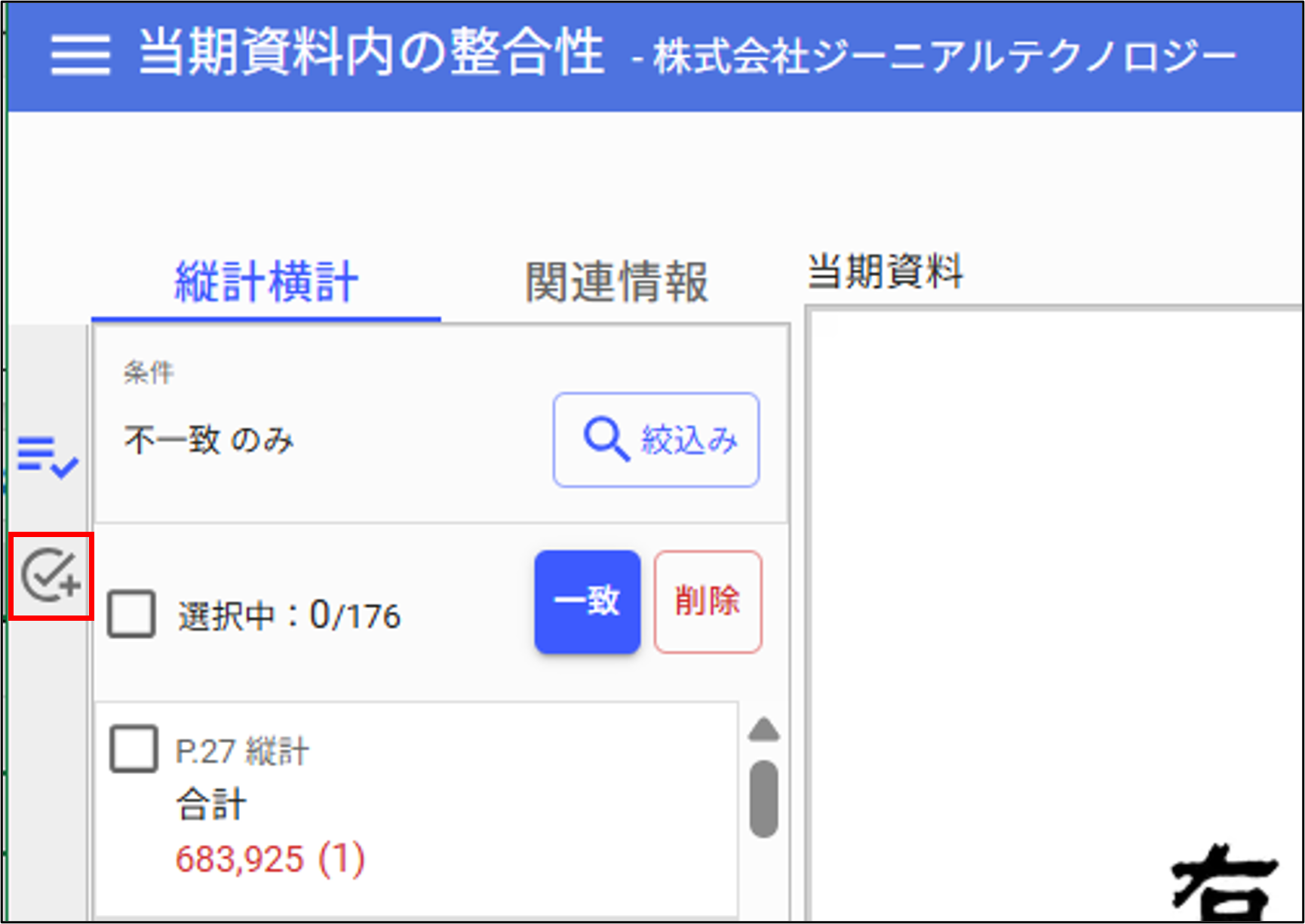 - [当期資料内の整合性]をクリックすると、【当期資料内の整合性】画面が表示