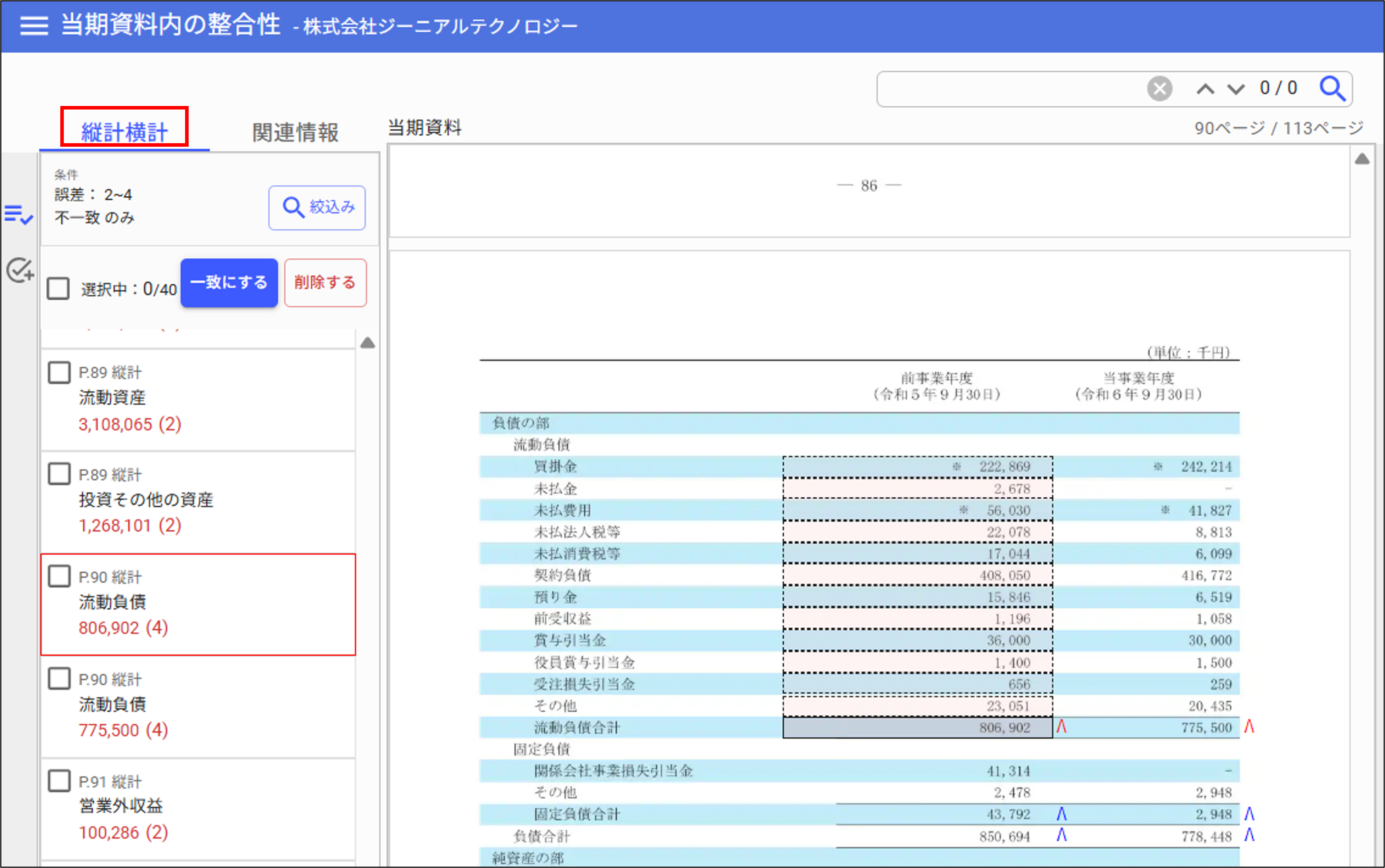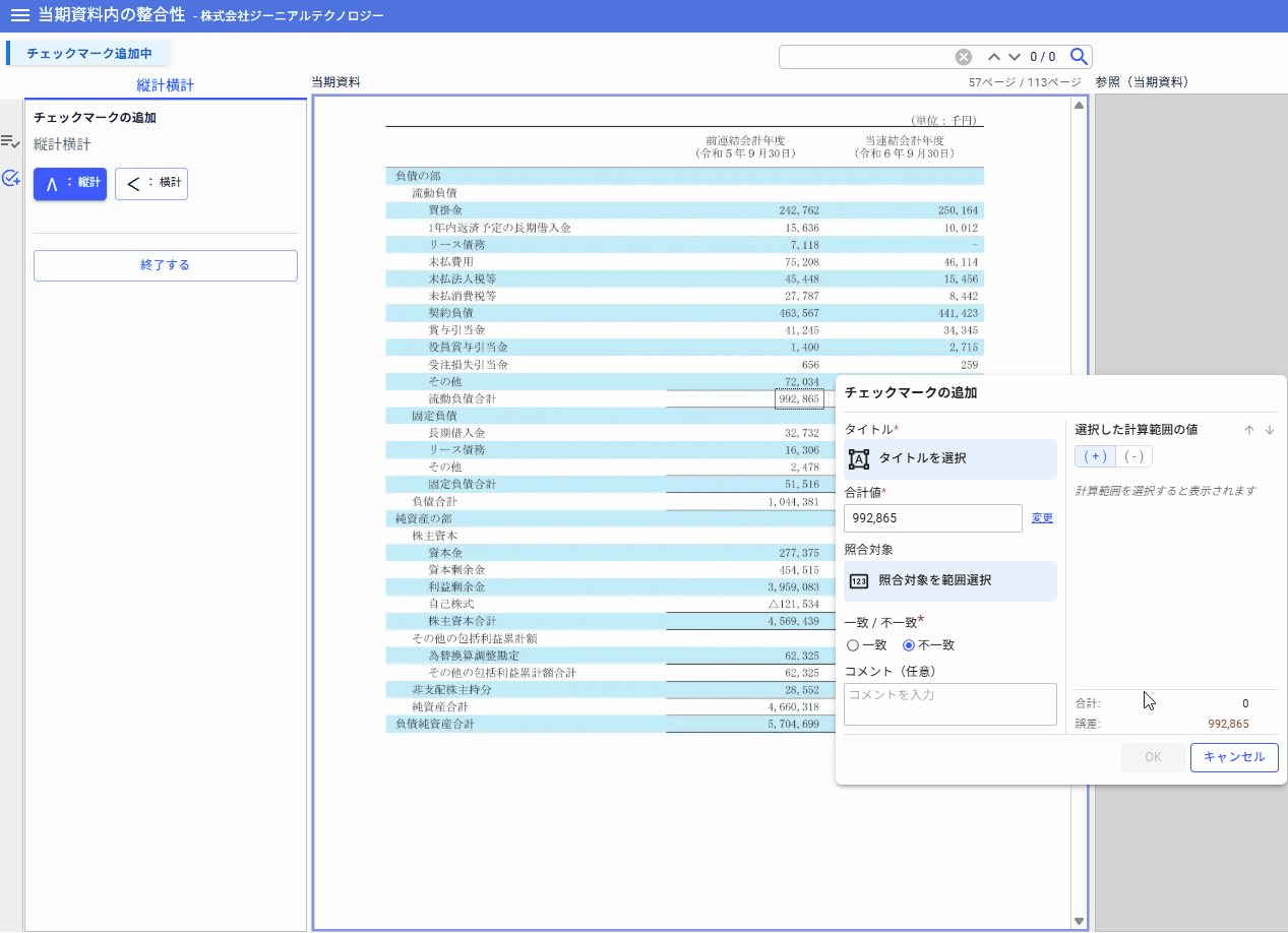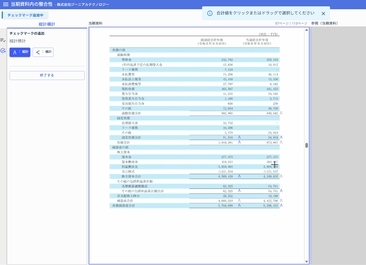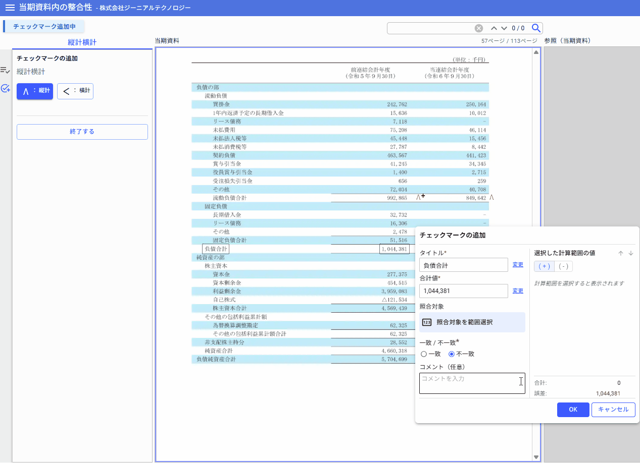 ジーニアルAIの開示チェック機能では、財務諸表内の合計値(縦計・横計)に誤差がないかを自動でチェックできます。