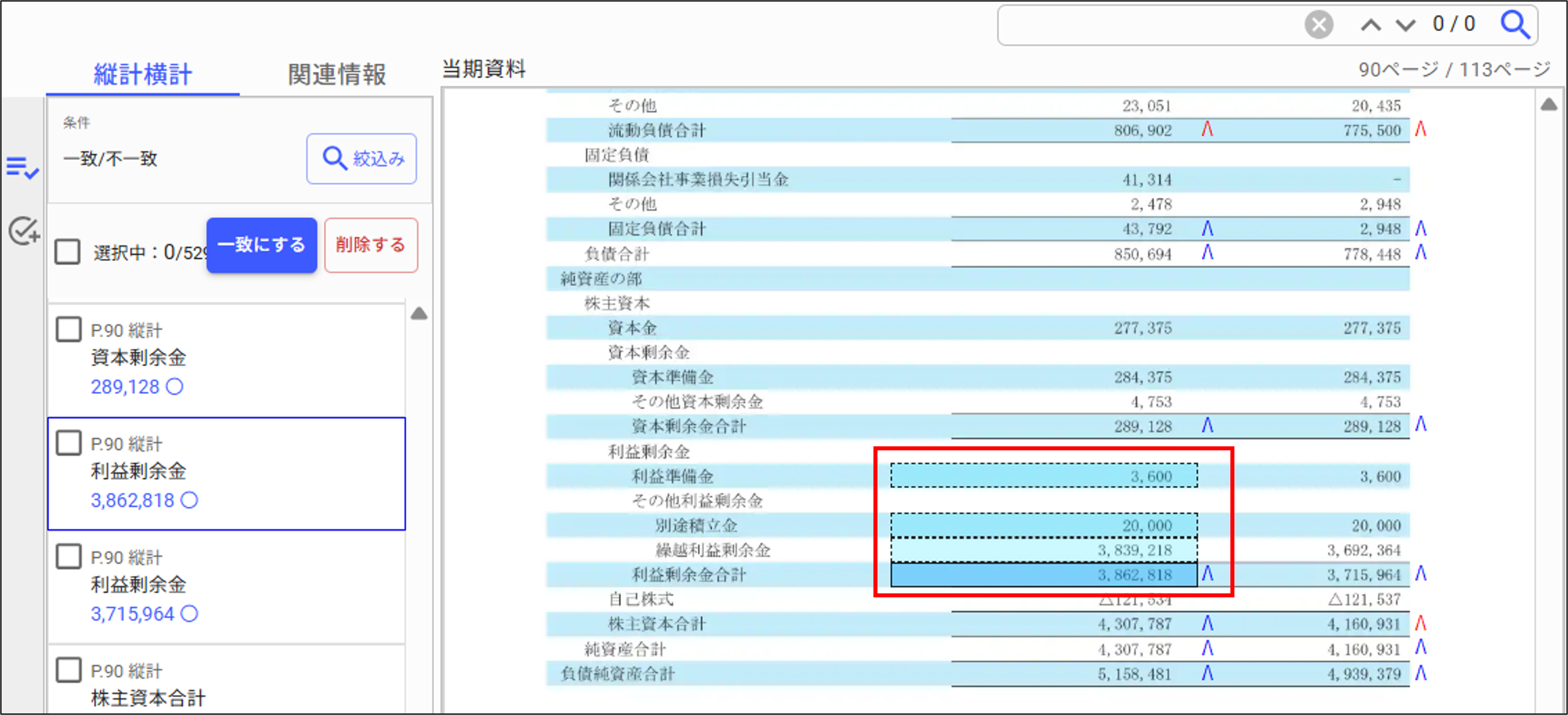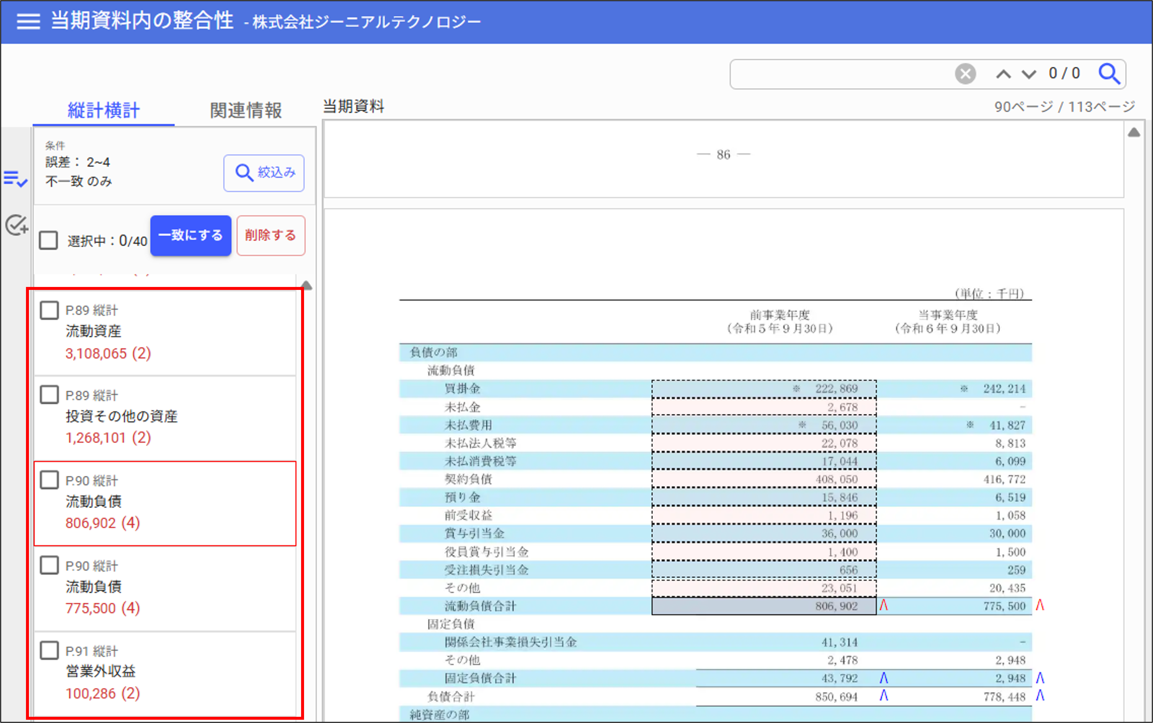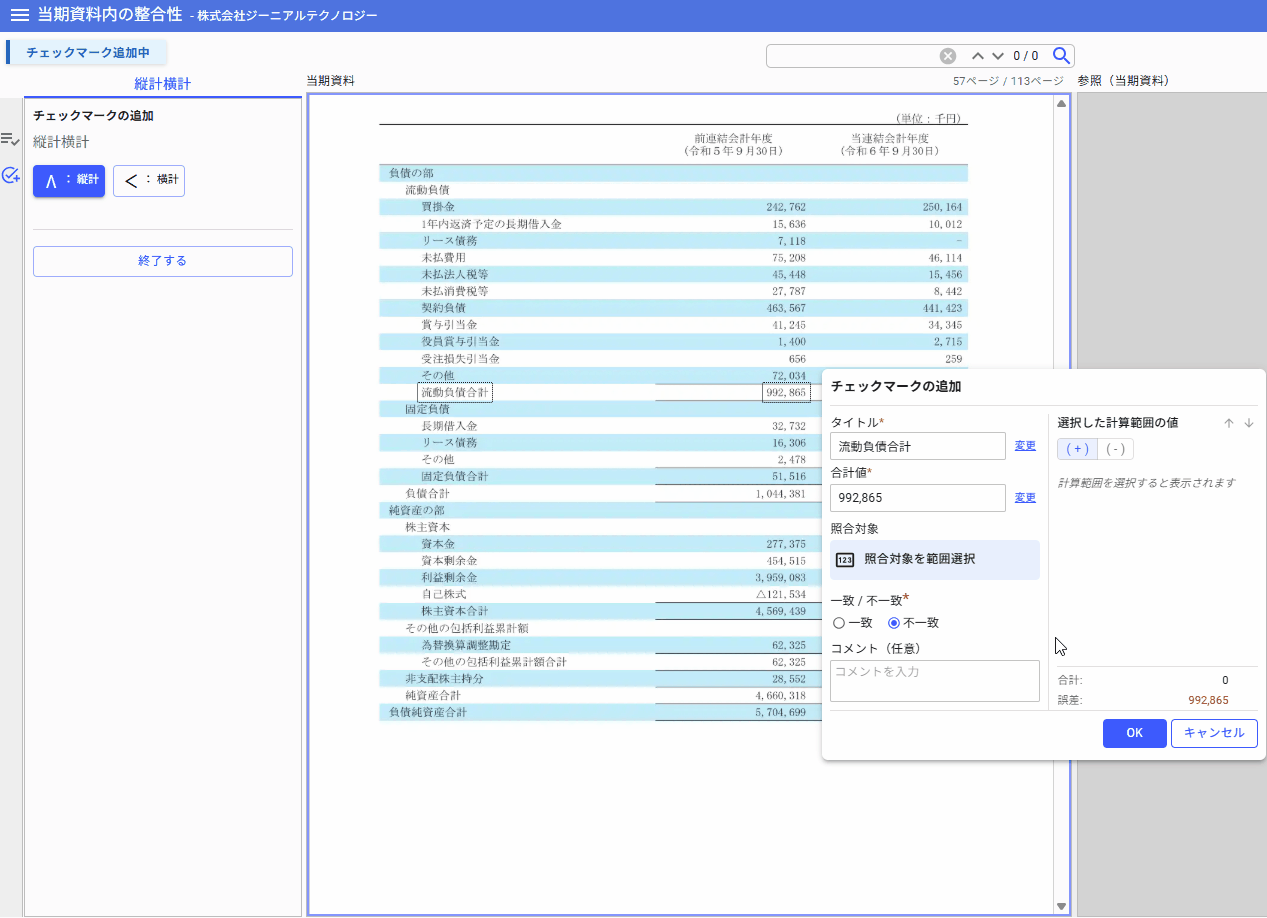 ジーニアルAIの開示チェック機能では、財務諸表内の合計値(縦計・横計)に誤差がないかを自動でチェックできます。