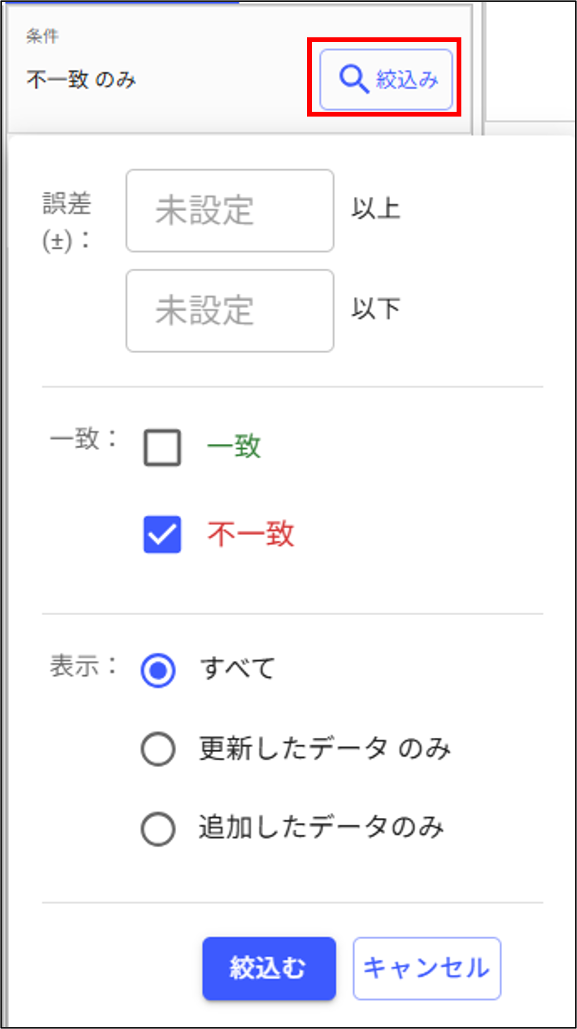 絞込み]をクリックすると、誤差の範囲や表示項目を選択可能