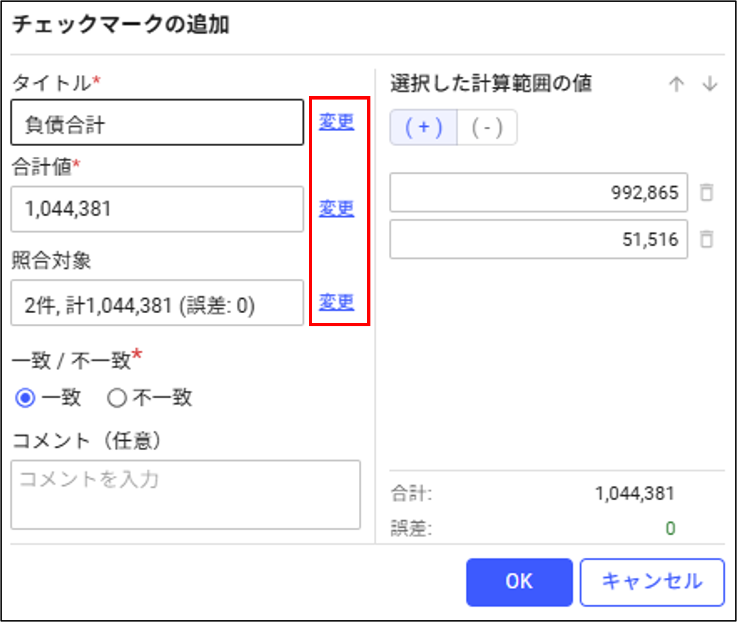 ※タイトル・合計値・照合対象で誤った箇所を選択した場合は、[変更]ボタンをクリックして、対象箇所を選択し直してください。