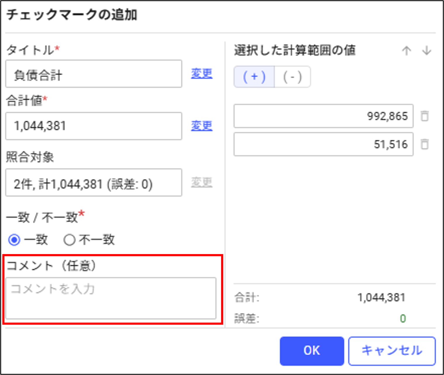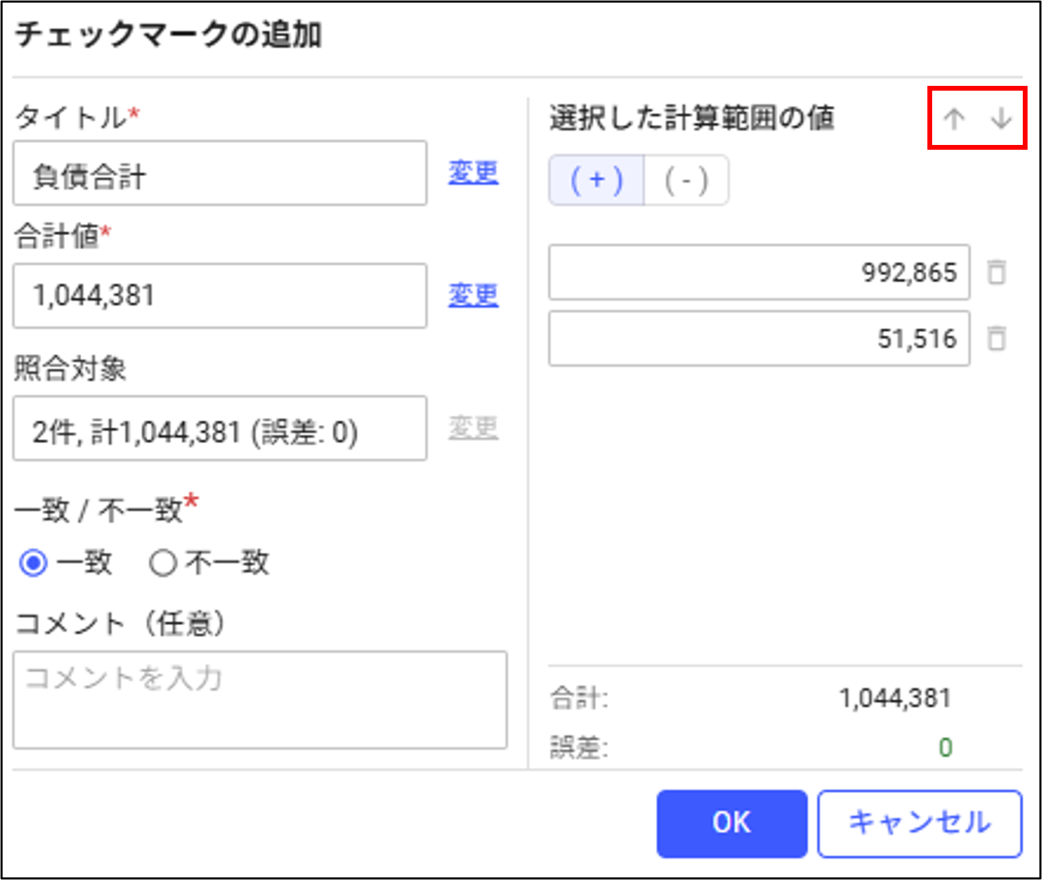 [チェックマークの追加]画面が開き、合計値には選択した数値が自動反映されます。
