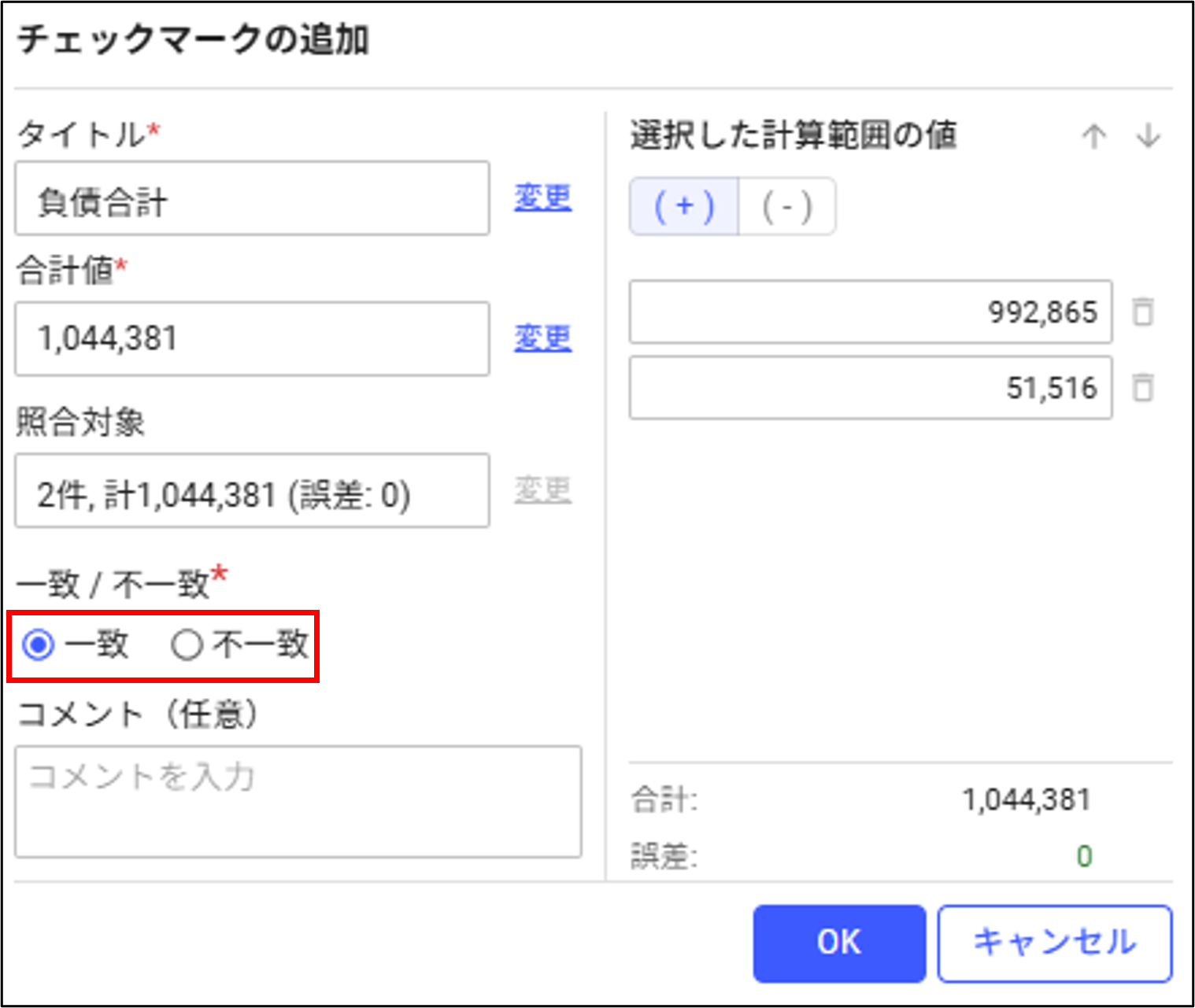 ※誤差が「1以下」の項目のみを絞り込み、一括選択で「一致にする」ことも可能