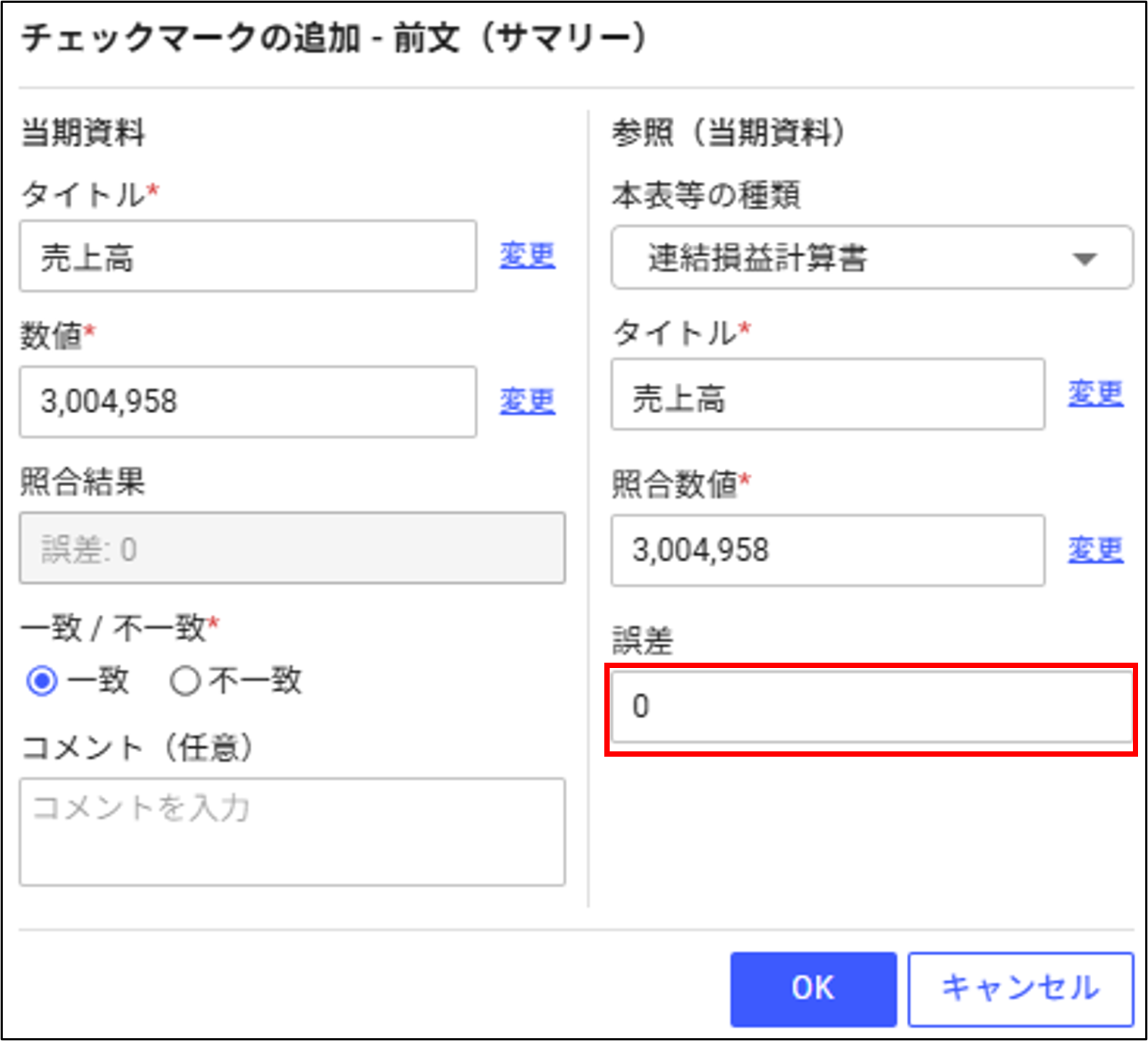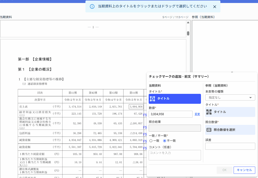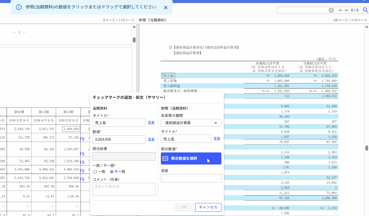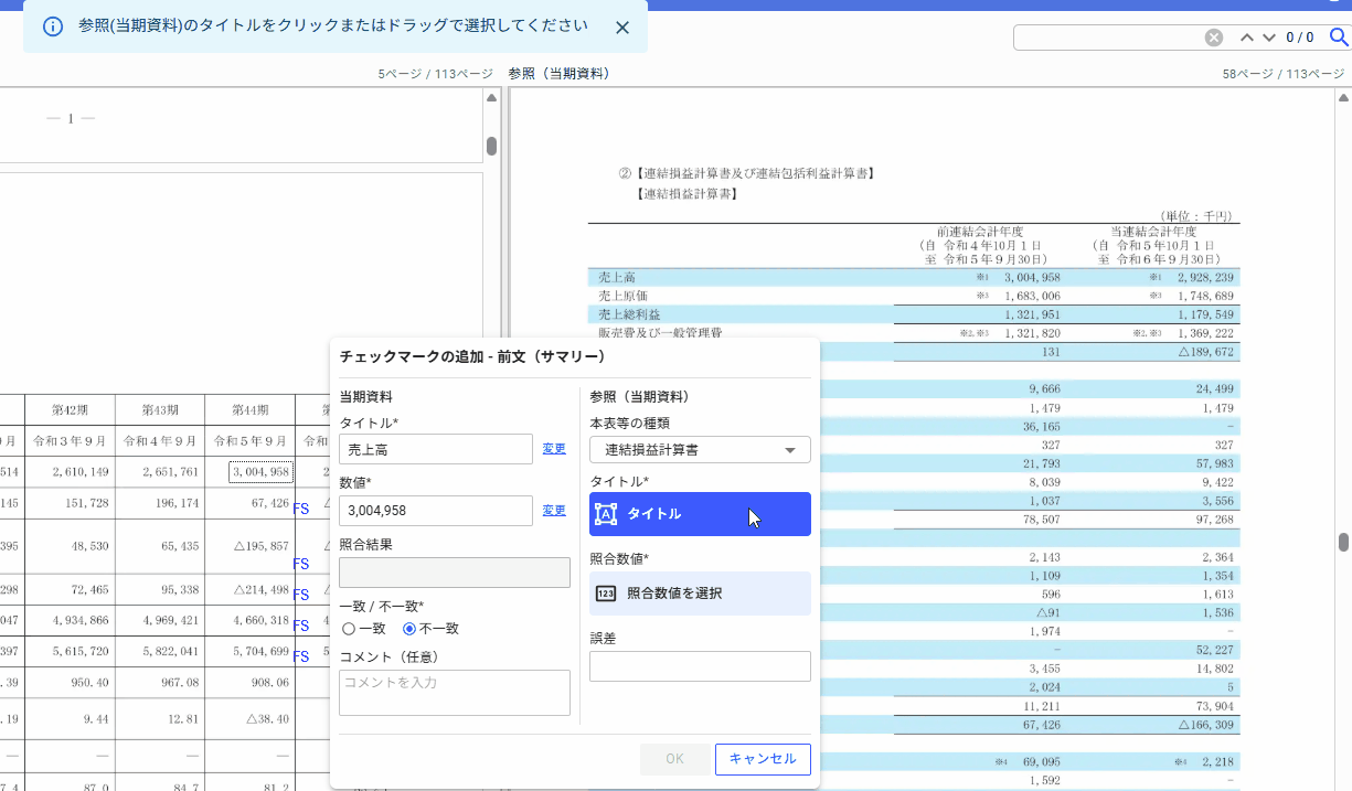 また、遷移した該当ページから当期資料側のタイトルと数値と一致する値が見つかった場合、参照(当期資料)側のタイトルと照合数値が自動で入力されます。