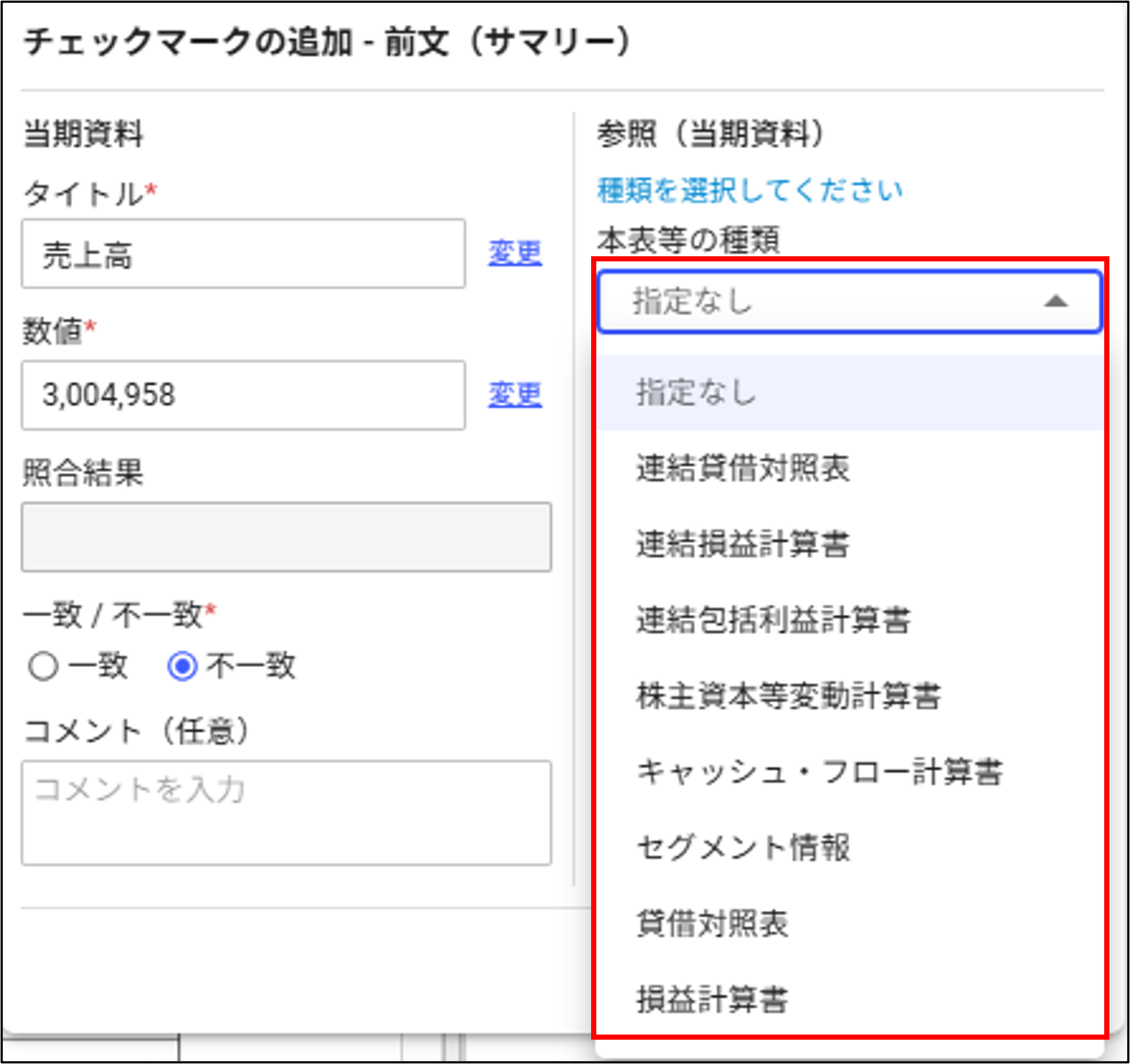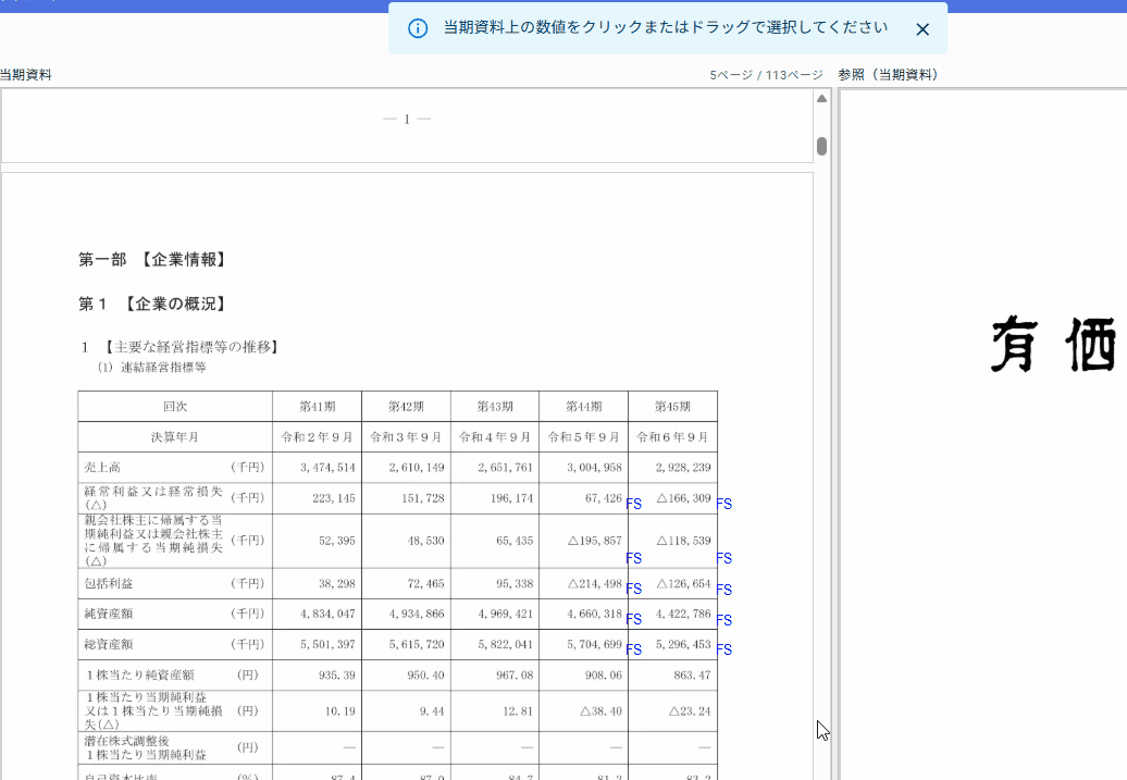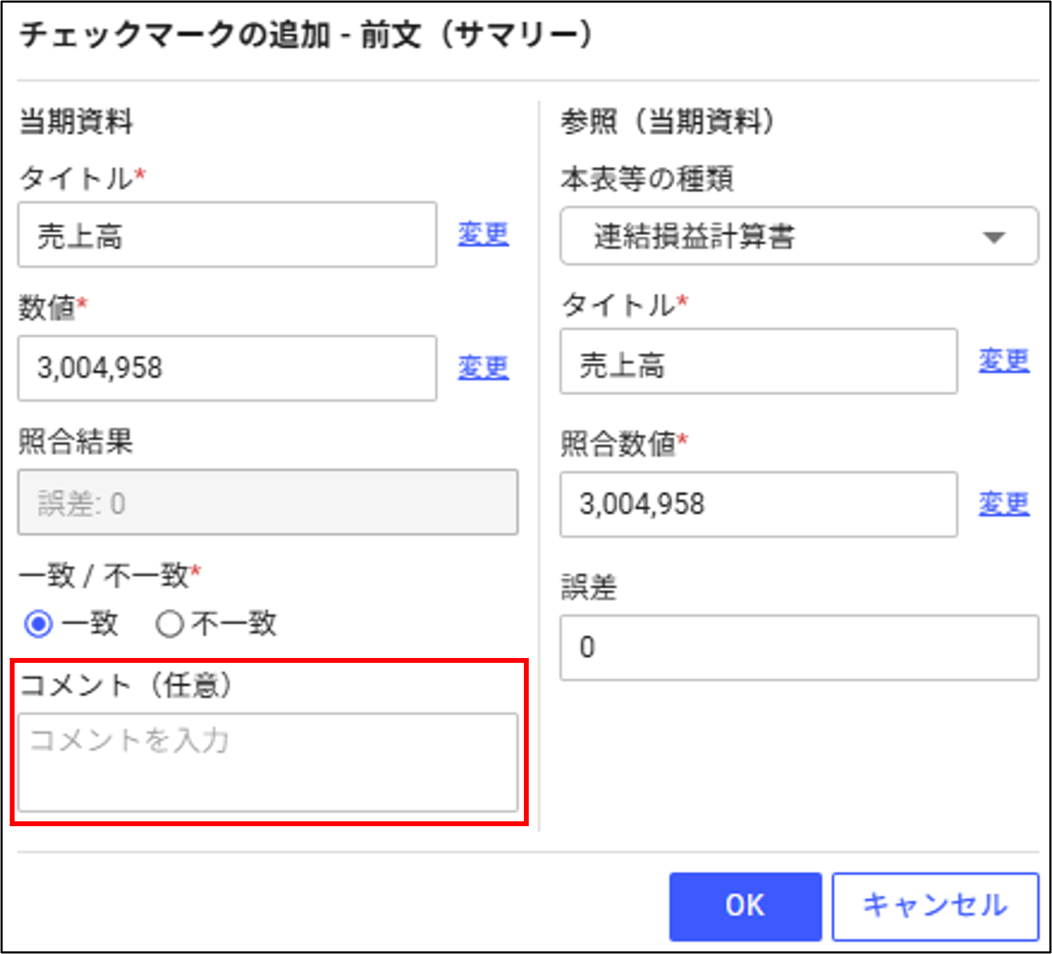また、遷移した該当ページから当期資料側のタイトルと数値と一致する値が見つかった場合、参照(当期資料)側のタイトルと照合数値が自動で入力されます。