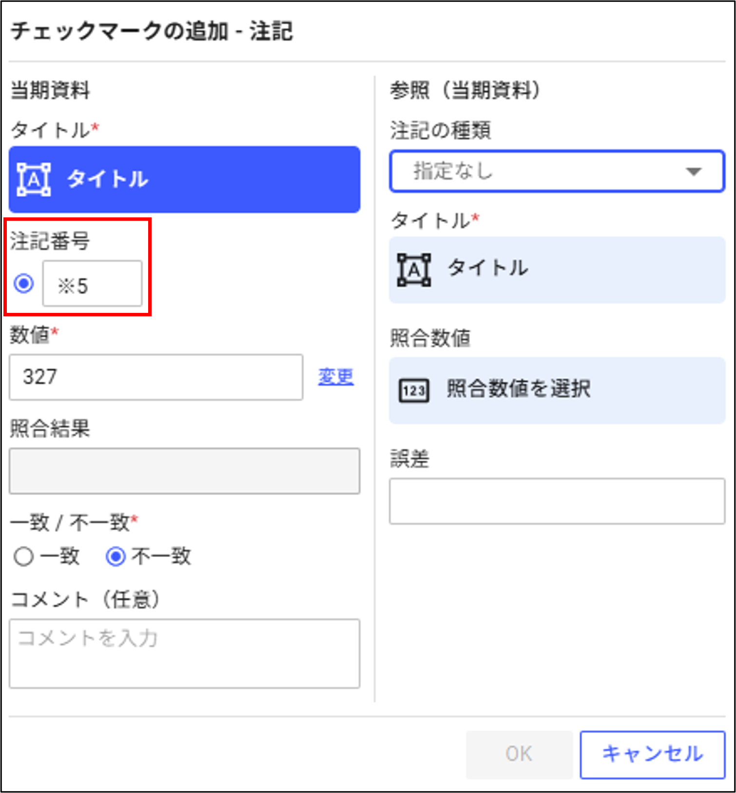 - 注記のチェックマークを追加する場合のみ、注記番号が表示されます。