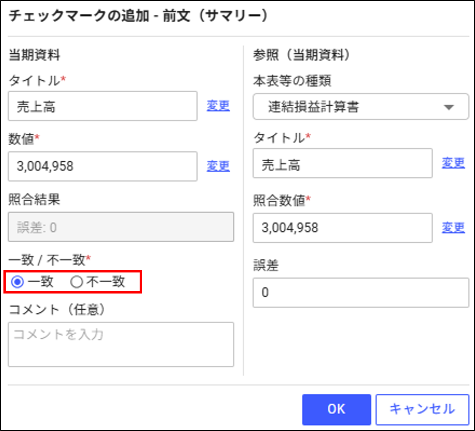 - 一致/不一致は自動計算を元に自動判定されます。変更したい場合は、手動で修正してください。