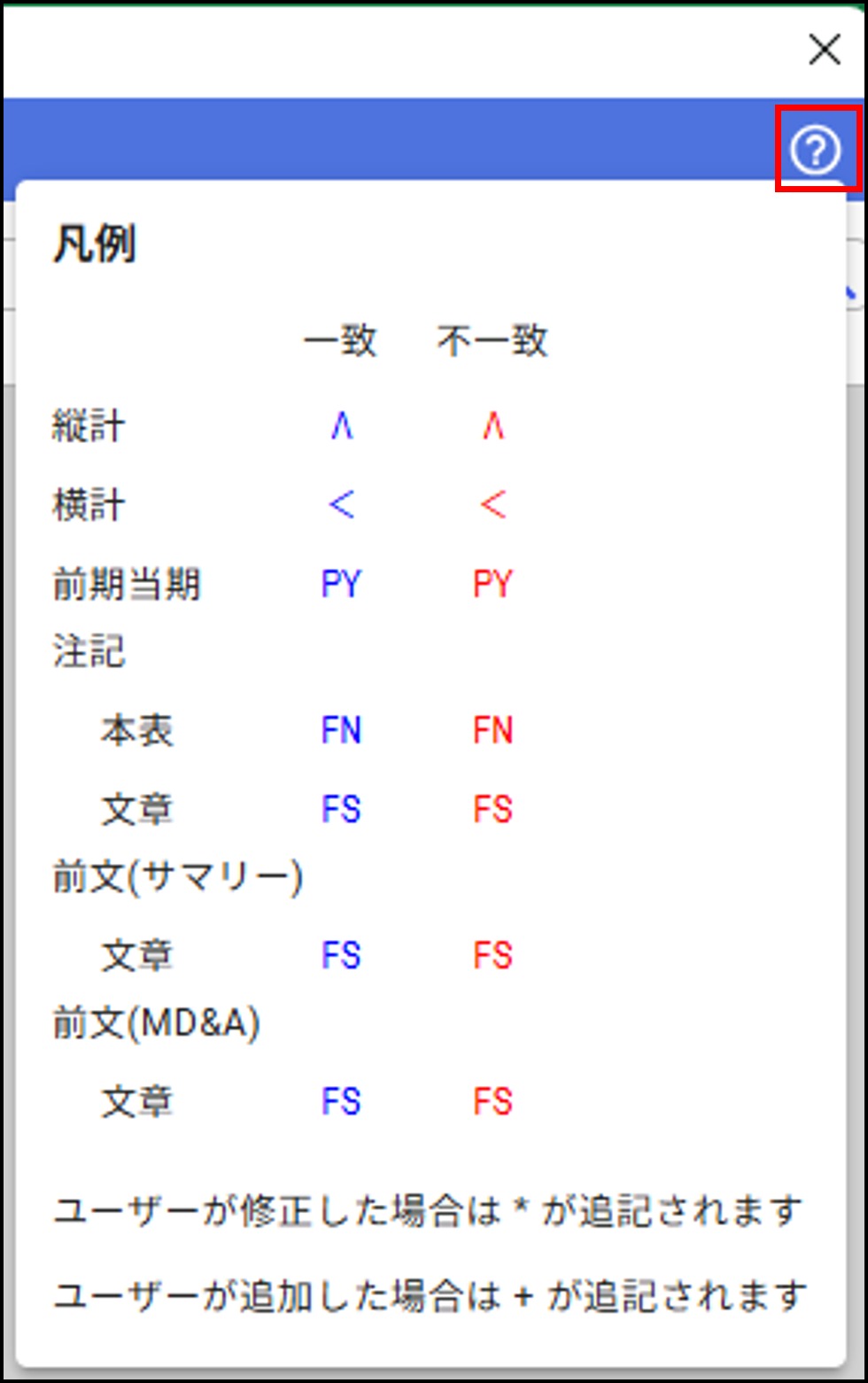 ・赤色:当期資料の値が前期資料と不一致、または前期資料に見つからなかった項目