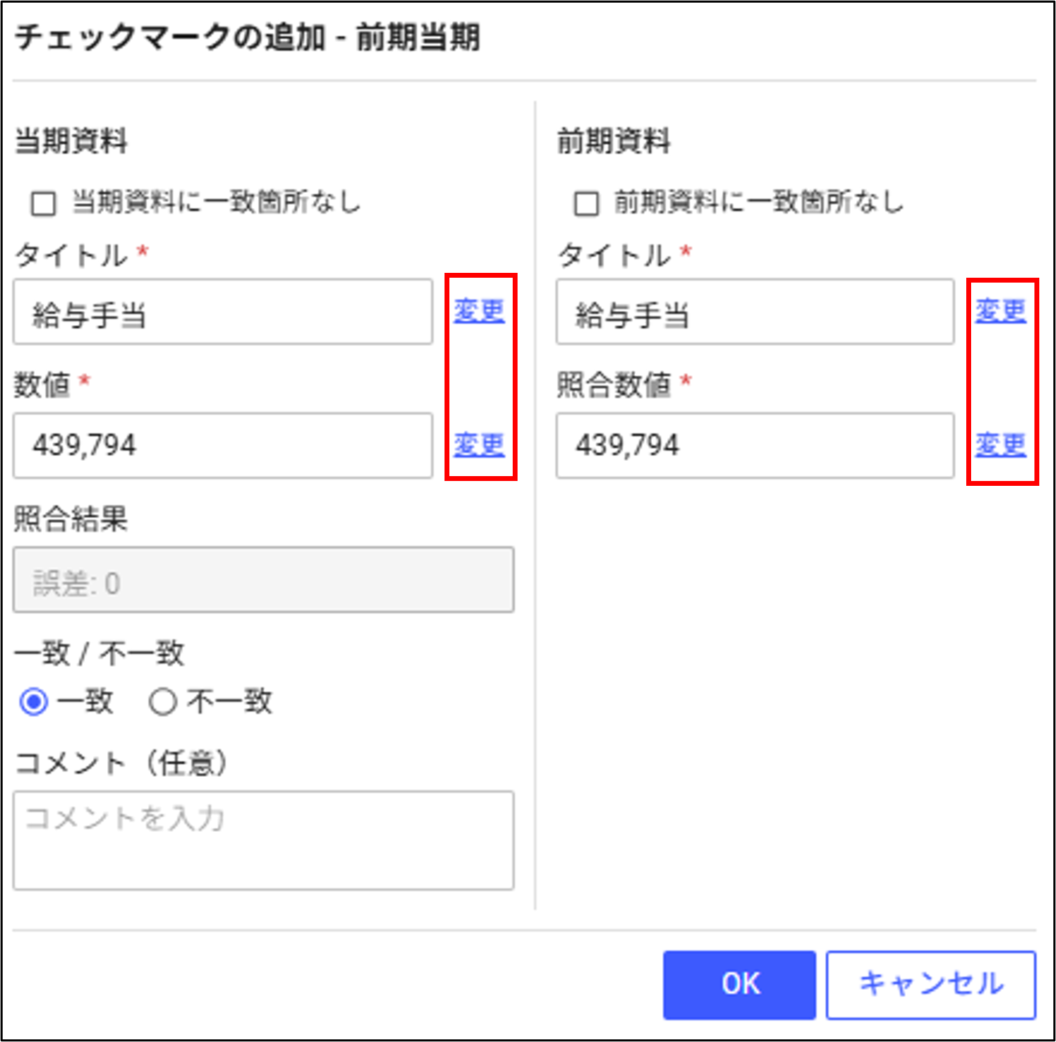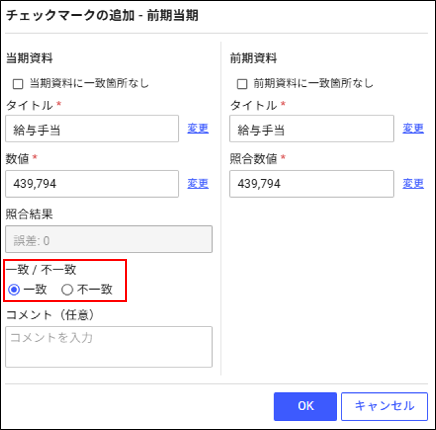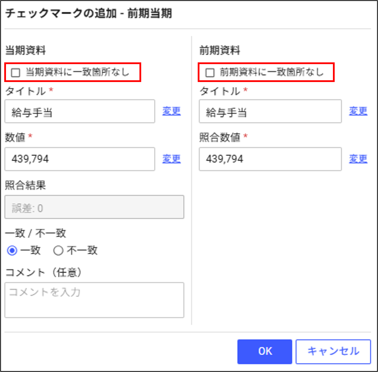 - 前期・当期どちらかで一致箇所がないチェックマークを追加したい場合は、該当する側の「一致箇所なし」にチェックを入れてください。