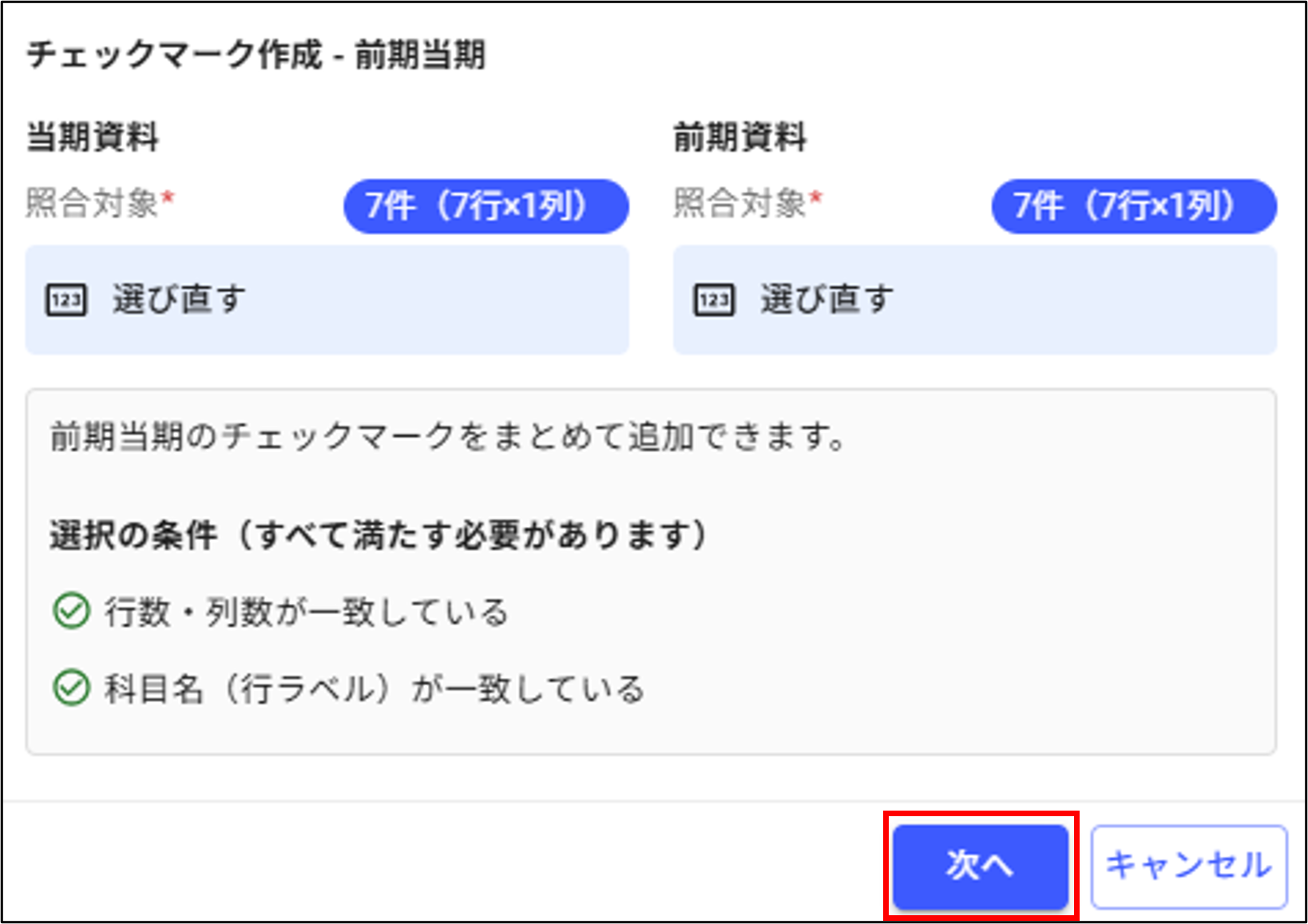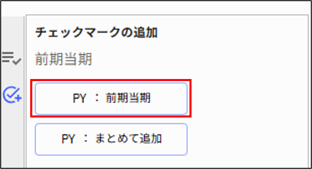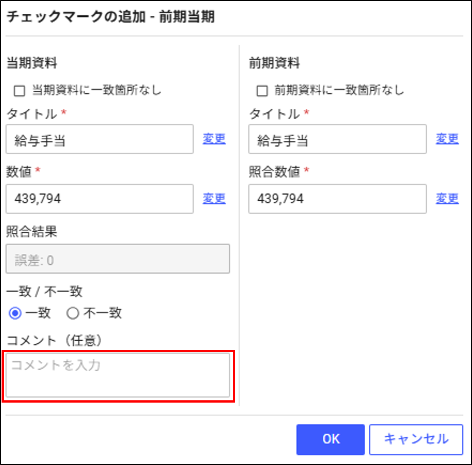 - 前期・当期どちらかで一致箇所がないチェックマークを追加したい場合は、該当する側の「一致箇所なし」にチェックを入れてください。