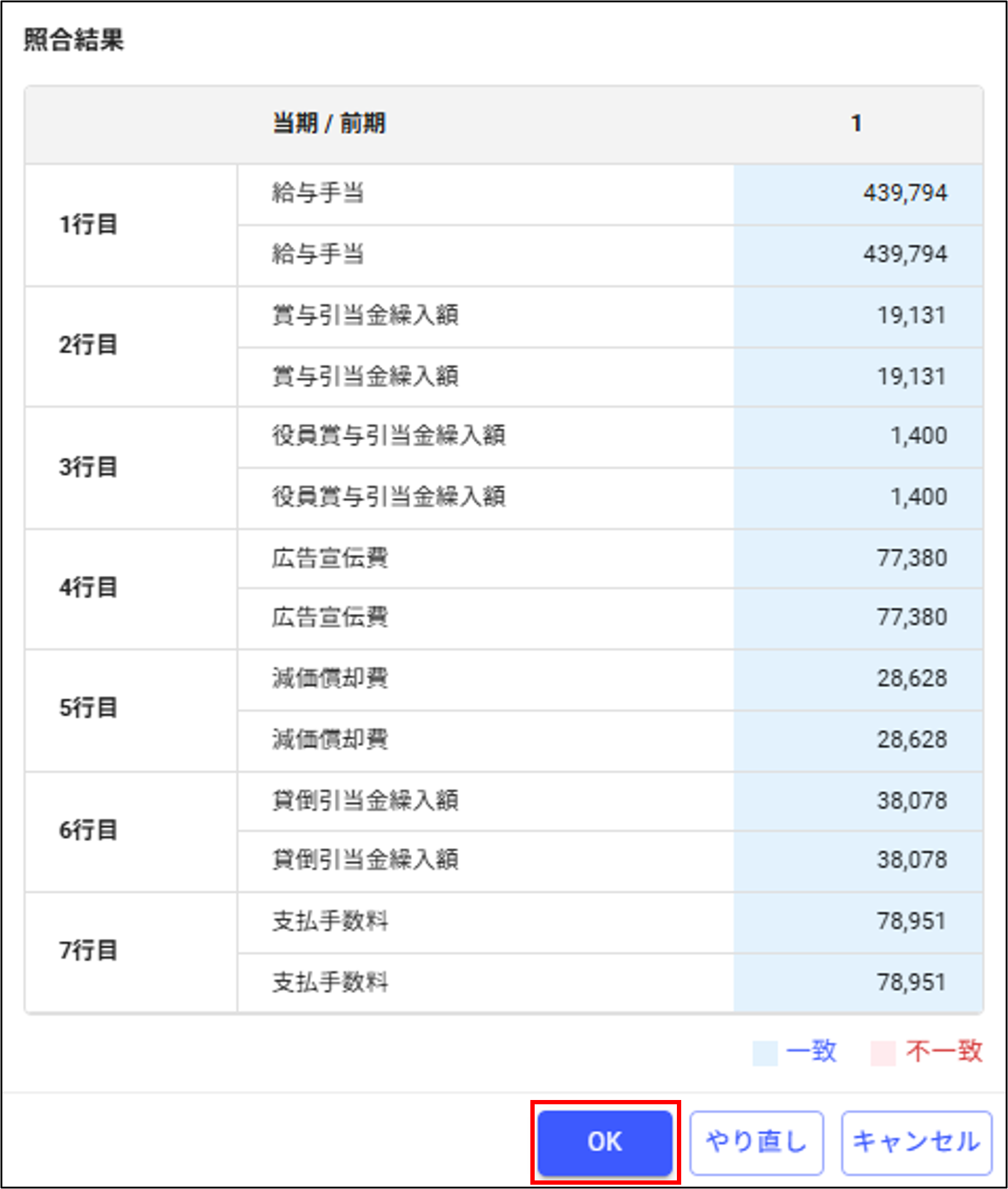 - チェック項目をクリックすると、当期と前期の一致箇所がハイライト表示